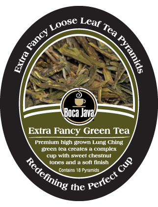 Hand selected in China. This traditional high grown Lung Ching green tea, packed inside our exclusive Boca Tea Pyramids, produces a complex cup with sweet chestnut tones and a soft finish. Extra Fancy Green Tea is often preferred by Western consumers for the straightforward, hearty green tea character we have all come to enjoy in phenomenal green teas. --18 count